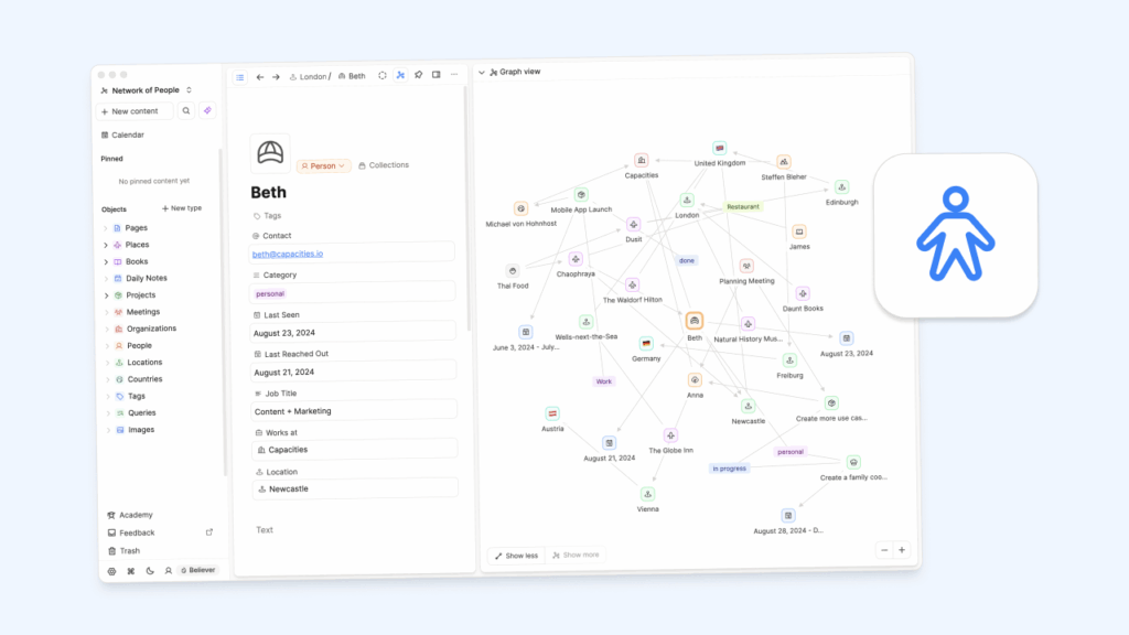 CapacitiesVisual thinkersContextual backlinks with surrounding textFree with generous limitsWeb, iOS/Android companions