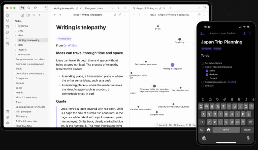 Obsidian has become a favorite among people who want to build connections between their notes and create a personal knowledge management system. It stores all your notes as Markdown files on your own device or local first, not on company servers, giving you complete control over your data.