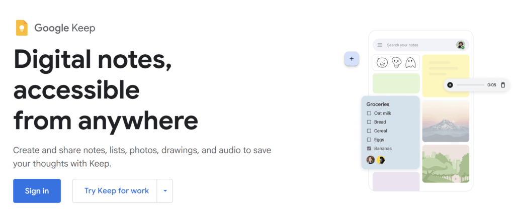 Google Keep is fully integrated with Google Workspace, making it an excellent choice if you’re already using Google’s ecosystem. Unlike most note-taking apps, Keep is designed more like digital sticky notes than a traditional notebook, focusing on speed and simplicity.